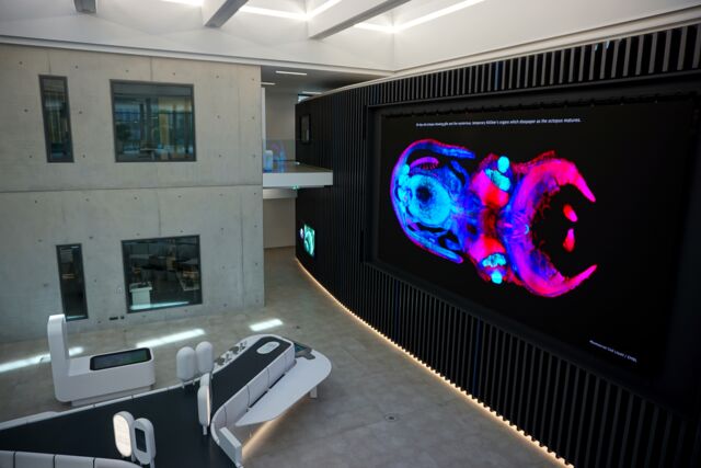 Additional touch screens and tables, vertical displays and explainer screens enable a deeper dive into specific topics and enhanced explanations as well as opportunities to interact. All the elements combine to engage, inform and inspire visitors to the building, and to foster a better understanding of molecular science and its relevance for individuals and society.