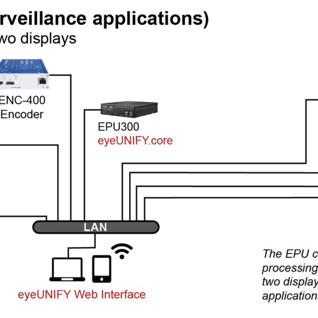 Un EPU-300 pilote un ou deux écrans. La configuration EPU répartit la charge du traitement de l'image sur plusieurs EPU-300, chacun pilotant un ou deux écrans. Cette solution est très populaire pour les applications de surveillance et les murs d'images LCD.