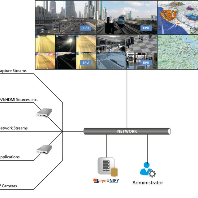 L'EPU-300 peut également être utilisé comme dispositif de traitement externe pour tout type d'affichage devant être intégré au concept eyeUNIFY Infinity Wall d'eyevis, une approche entièrement basée sur le réseau pour la distribution des signaux et des commandes.