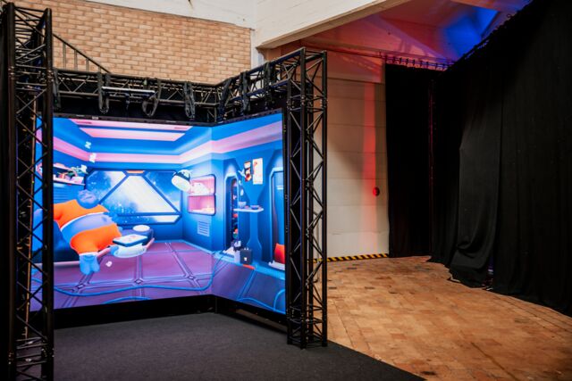 Lors de la création du contenu pour la scène VP, une solution OptiTrack de NaturalPoint a été utilisée pour suivre les mouvements des visiteurs et ajuster le contenu rendu sur le mur d'images en temps réel. De cette manière, les visiteurs sont plongés dans un monde virtuel.